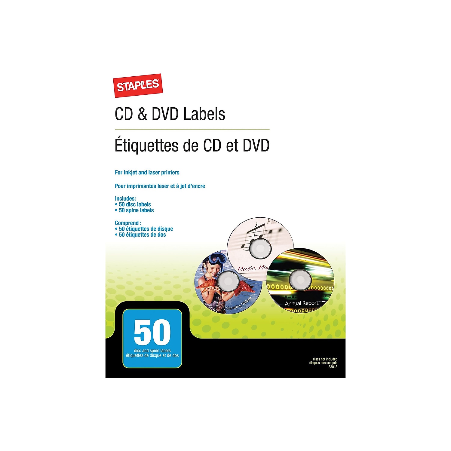Staples Laser/Inkjet Media Labels, White, 50/Pack (33013-CC) These Staples CD/DVD labels are sold in packs of 50, letting you tackle large labeling projects. CD/DVD labels for organizing digital media, White color for an attractive look, Features a permanent adhesive backing for a secure bond, Total 50 CD/DVD and 50 spine labels per pack, Compatible with laser and inkjet printers for maximum flexibility,