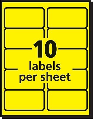 Avery(R) High Visibility Shipping Labels, 2" x 4", Neon Assorted, 500 ... Avery High Visibility Laser Shipping Labels, 2" x 4", Neon Green, 1000 Labels Per Pack (5976) 3 (1) $103.99 Box This item ships FREE * Qty Avery High Visibility Laser Shipping Labels, 2" x 4", Neon Magenta, 10/Sheet, 100 Sheets/Pack (5974) 5 (1) $82.99 This item ships FREE * Qty Add to Cart